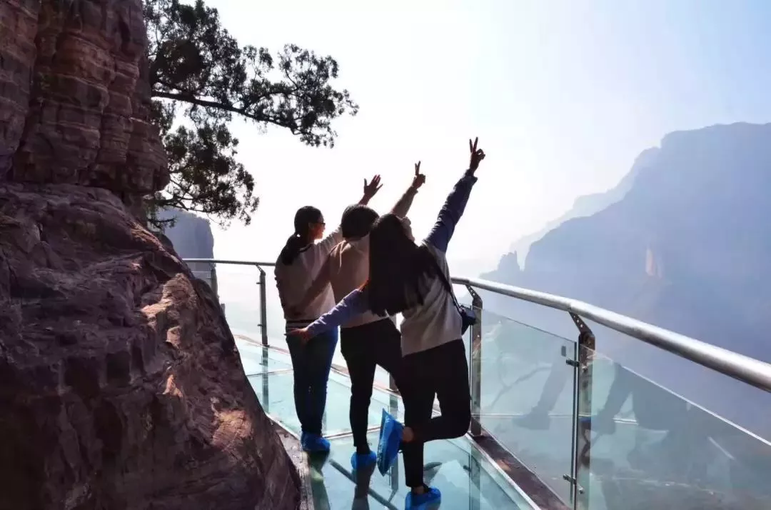 天界山玻璃棧道修建于海拔1300余米的“云峰畫廊”紅巖絕壁處,站在棧道可鳥瞰八里溝和九蓮山全景,有緣人還能看到九蓮“佛光”,遠望“雙佛臥太行”奇觀。