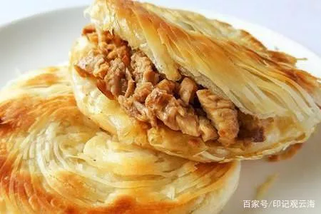 3、脂油燒餅,又叫脂油餅,是河南省三門峽市靈寶地區(qū)的著名特色小吃。脂油燒餅以面粉、豬板油、精鹽、蘇打、棉籽油、蔥花等為原料做成餅坯,放入平底鍋中烙至兩面焦黃即可。其吃法有兩種,一種是把燒餅擠壓抖開,成條成片,堆在碟子里,用筷子夾著吃。另一種是保持餅的原狀,咬開后層次分明,外酥內(nèi)軟,濃香撲鼻。