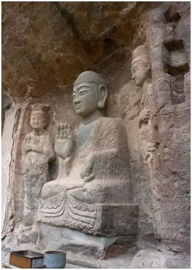 第2 窟,北周開(kāi)鑿。平面方形平頂窟,前壁已毀。洞窟面闊2.28、進(jìn)深1.65、高 1.65 米??邇?nèi)三壁前均有壇基,上有方形佛座,并各有一佛,形成三佛布局,每身佛兩側(cè)都有脅侍菩薩。佛低平肉髻,面相方圓,身著雙領(lǐng)下垂袈裟,內(nèi)有僧衣,袈裟下擺在佛座前作人字形分為左右兩瓣,衣褶擺布流暢。菩薩殘損嚴(yán)重,僅存輪廓。洞窟壁面泥層上有北宋政和三年(1113 年)游人刻劃題記。