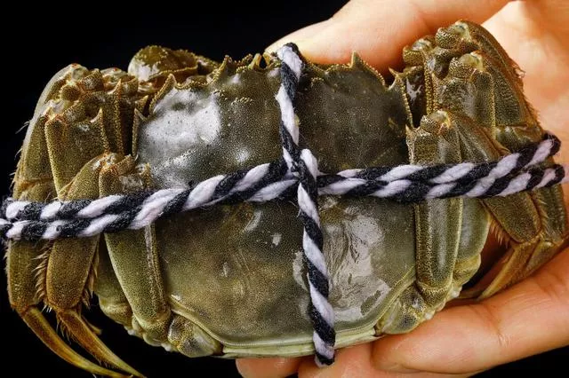 2、捆綁。捆綁螃蟹是非常重要的環(huán)節(jié),用棉線將蟹腳捆綁牢靠。捆綁的目的,是為了防止蒸鍋過程中大閘蟹掙扎,斷裂大腿,進而會失去觀感。