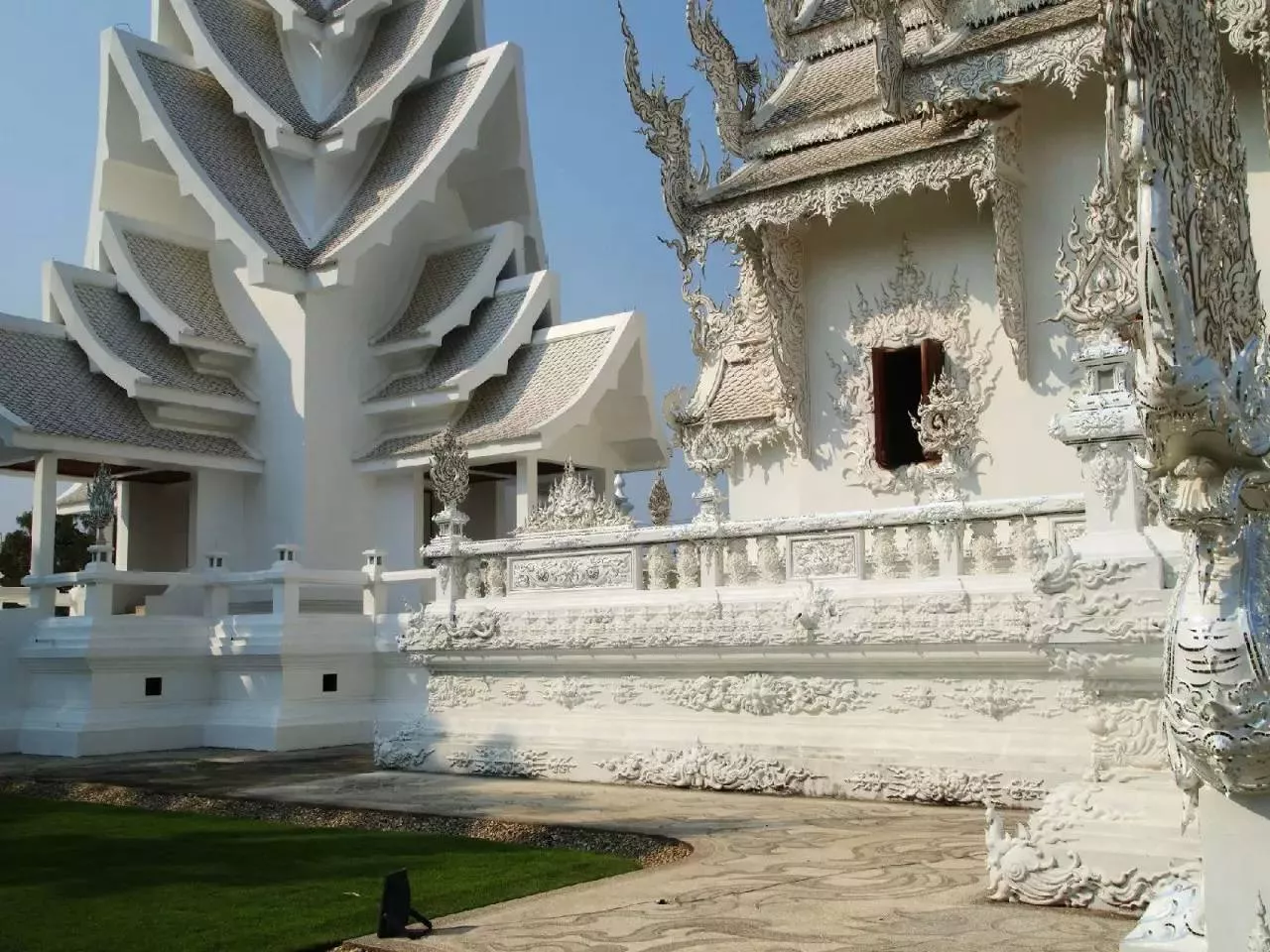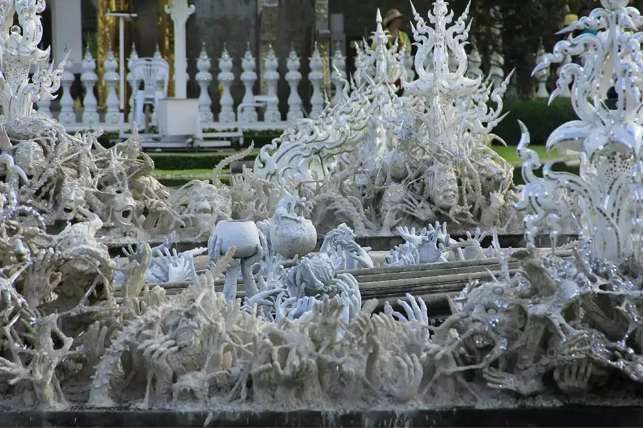 入口前放滿純白色卻又形象可怕的雕塑,凝造出地獄意境;過(guò)橋后通往白廟本殿,卻一瞬之間由邪轉(zhuǎn)善。殿內(nèi)墻壁一面畫有如煉獄般的邪惡魔鬼、災(zāi)難,更在不同角落中畫上眾多家喻戶曉的動(dòng)畫、電影角色,由皮卡丘、憤怒的小鳥(niǎo)、蝙蝠俠等帶出這個(gè)混亂世界的意思,令人印象深刻。向佛像伸延的左右兩邊墻上,畫有在佛教之中由惡轉(zhuǎn)善的人類,逐漸成仙成佛的救贖過(guò)程。殿內(nèi)禁止拍照,必須親眼細(xì)看。這座白廟其實(shí)尚未完工,庭園與側(cè)殿等地仍然處于施工狀態(tài),據(jù)說(shuō)整個(gè)工程要到2070年才能完工,但仍無(wú)減白廟的吸引力。