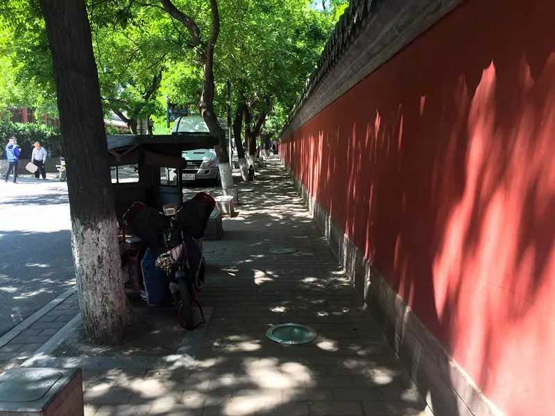 往里走我第一個感覺就是幽靜涼爽,街旁的古槐樹在天空織成一張大網(wǎng),把驕陽都擋在外面,路上綠蔭如蓋。左邊是灰墻灰瓦的四合院民居,有的改成小賣部有的改成飯店,聊天的大媽會坐在店門口問你要不要喝自家做的酸梅湯,幾個大爺搖著蒲扇圍成一圈下棋,邊看邊走要小心突然上前乞討的老人,和擺攤算命測字的“大師”,良心建議是別理他趕緊走就對了。