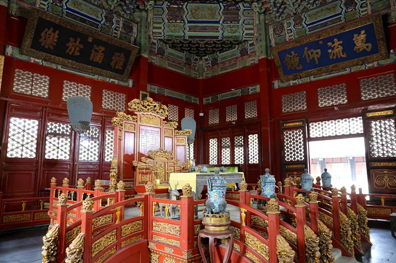 殿內(nèi)布置的也非常講究,彩繪的天花頂、桌案、屏風、鼎爐一個不少,當年皇上就坐在金光閃閃的龍椅上給跪在外面的學(xué)子們講講自己的心得體會?,F(xiàn)在的國家領(lǐng)導(dǎo)們也不時地在大學(xué)里演講,估計這個習慣就是從這來的。