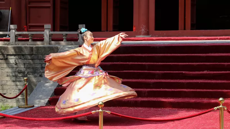 在莊重悠揚的樂曲中,正殿的數(shù)道大門被輕輕推開,時光好像倒流了千年,一群手捧竹簡,頭戴冠巾的儒生們恭敬虔誠的誦讀著流傳千年的”有朋自遠方來,不亦樂乎“。美麗的少女們,邁著優(yōu)雅的步子,演義了一段靈動曼妙雍容華美的漢代宮廷樂舞。