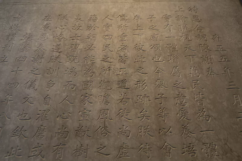 乾隆石經(jīng)也叫十三經(jīng)石碑,陳列在孔廟和國子監(jiān)之間的展覽館中,是國子監(jiān)學(xué)生蔣衡花了十二年抄寫而成,然后乾隆皇帝命人將這十三部儒家經(jīng)書刻到石碑上,一共189座。