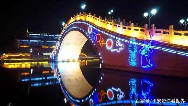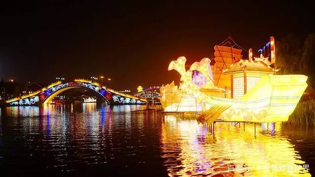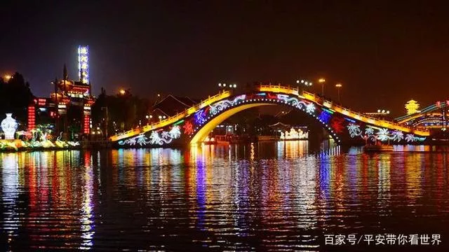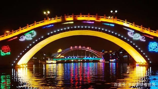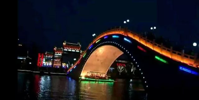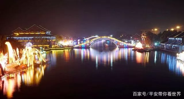 亭臺上掛滿了燈飾,橋面上掛滿了飛虹般的拱橋,河面上的彩燈和倒影灑滿了未散盡的色彩和光芒,浮光掠過,夜幕不斷變換,別有風(fēng)味。