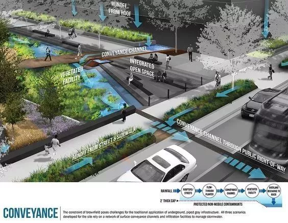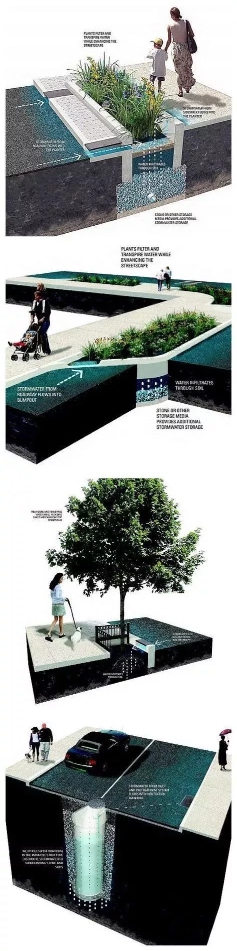 這些生物技術(shù)共同構(gòu)成了(城市)雨洪管理體系,從源頭/運輸/排滯/終點等階段分別進行處理,并進行循環(huán)再利用,以達到合理利用水資源的目的。