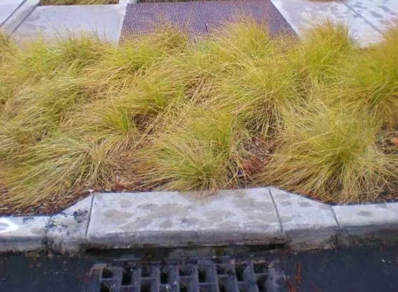 植草溝的主要作用是去除地表徑流中的污染物,在華盛頓長度為60m的植草溝實驗中,對于SS去除率可達60%,碳?xì)浠衔锶コ士蛇_75%,金屬污染物去除率可達67%,也就是說,大部分污染物可在60-75m的距離中去除[4]。