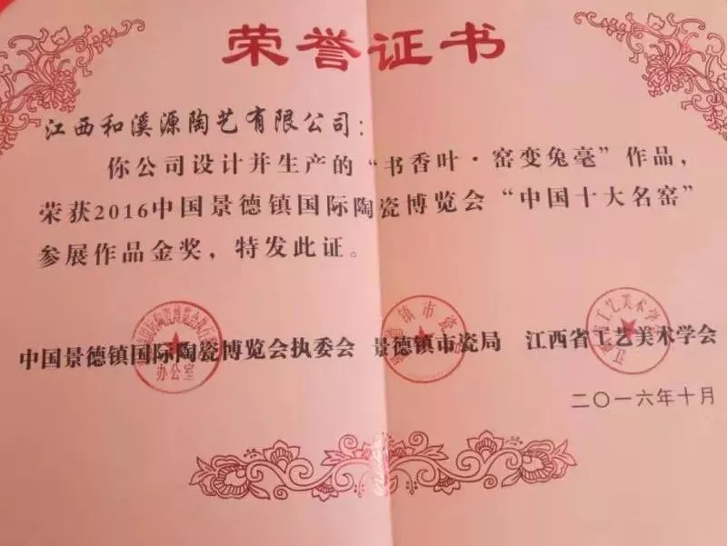 ?2016年10月,參加中國?景德鎮(zhèn)國際陶瓷博覽會獲“中國十大名窯”金獎