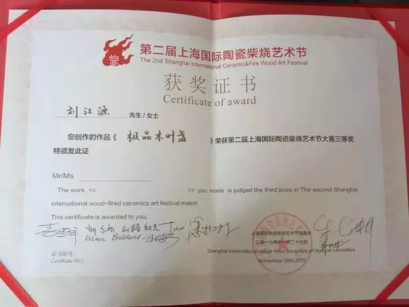 ?2017年11參加上海國際陶瓷柴燒節(jié)藝術組委會舉辦的第二屆上海國際陶瓷柴燒節(jié)藝術節(jié)大賽獲三等獎