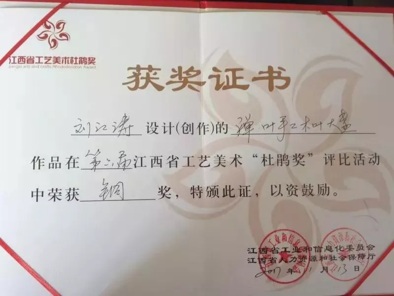 ?2017年11月參加江西省工業(yè)和信息化委員會,江西省人力資源和社會保障廳聯(lián)合舉辦的第六屆江西省工藝美術“杜鵑獎”評比活動獲銅獎