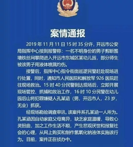 云南一男子網(wǎng)購(gòu)氫氧化鈉液體,并且經(jīng)過(guò)了二次加工,隨后在開(kāi)遠(yuǎn)市東城幼兒園,對(duì)該院內(nèi)包括老師孩子在內(nèi)的54人實(shí)施了惡行。據(jù)了解,11月11日,涉事男子由于工作不順,外加上自身心理扭曲,隨后便從網(wǎng)上購(gòu)買并且制作了氫氧化鈉液體,并且偷偷跑進(jìn)開(kāi)遠(yuǎn)市東城幼兒園,用自制的液體,噴濺了該園內(nèi)的部分老師和學(xué)生,導(dǎo)致老師和學(xué)會(huì)們受到了灼傷。據(jù)了解,現(xiàn)場(chǎng)輕度癥狀48人,中度癥狀4人,而重度癥狀為2人。幸運(yùn)的是,受傷的老師和學(xué)生都沒(méi)有生命危險(xiǎn)。而該男子卻買來(lái)經(jīng)過(guò)加工制作之后,用來(lái)傷害了幼兒園的老師和學(xué)生,這樣可惡的行徑,實(shí)在讓人氣憤。下午4點(diǎn)10分左右,民警在幼兒園的后山處,發(fā)現(xiàn)了該男子,并且成功的將其抓獲。接著警方通過(guò)調(diào)查,了解到了孔某涵的作案動(dòng)機(jī)。加上成年以后,每每工作都遇到坎坷,事業(yè)不順,因此便產(chǎn)生了“報(bào)復(fù)社會(huì)”以及“厭世”的情緒。所以孔某涵便在網(wǎng)上購(gòu)買了氫氧化鈉,并且經(jīng)過(guò)二次制作后,跑到幼兒園進(jìn)行了報(bào)復(fù)行為。案發(fā)之后,不少人也是譴責(zé)了孔某涵。雖然自己童年遭遇不幸,但是也不能以此去侵犯他人的生活。