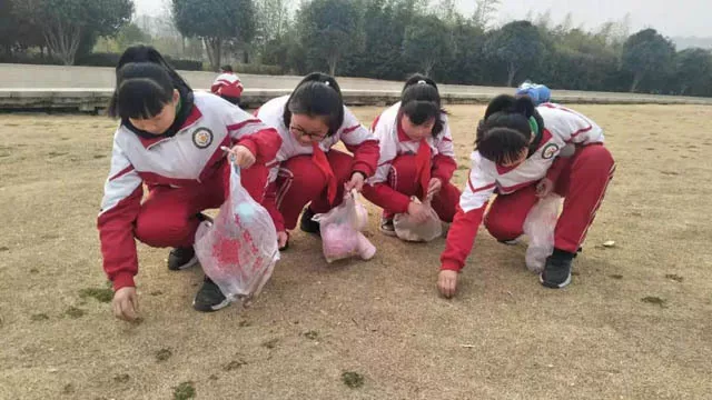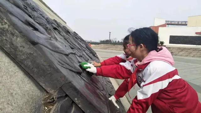 同學(xué)們認(rèn)真地擦拭廣場上的浮雕,宣傳欄和雕塑等???,同學(xué)們都蹲在地上,用自己的小手撿起一片片垃圾。