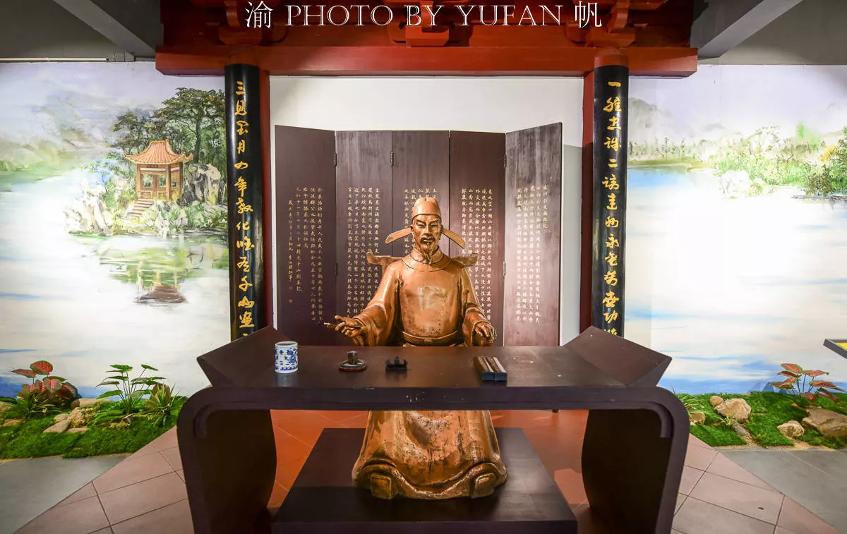 燕喜園里面最主要的建筑劉禹錫紀(jì)念館,大樓飛檐斗拱,采用朱紅色的支柱,屬于古典式宮廷建筑風(fēng)格。樓前塑有詩(shī)豪劉夢(mèng)得的青銅雕塑,右手提筆,左手執(zhí)扇,仿佛正是他在此寫下《陋石銘》的模樣?!吧讲辉诟?,有仙則名。水不在深,有龍則靈。斯是陋室,惟吾德馨……”,似乎是說,燕喜山不高,但是這里卻出了一位神仙(廖沖),水(燕喜園的前面以前是海陽(yáng)湖)不在深……