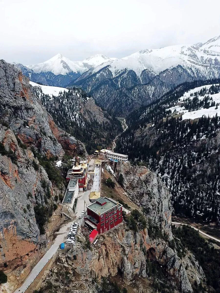 尕爾寺坐落于一座海拔3700多米的高山上,分為上寺和下寺。山的北面全是奇峰怪崖、寒風(fēng)料峭,但南邊卻是略有坡度、溫暖向陽。尕爾寺的數(shù)百間建筑,就不規(guī)則的分布在山南邊的這個(gè)大山坡上,從下至上,直到山頂。