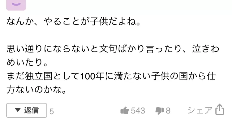“這不就是小孩才會(huì)干的事嗎。不能如愿以償就開始唧唧歪歪哭天喊地,不過那也沒辦法,畢竟只是個(gè)獨(dú)立還沒滿一百年的‘小孩國’罷了?!?/p>