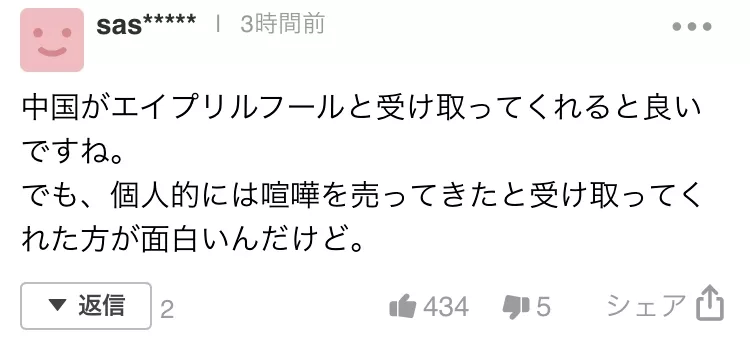“中國把它看作愚人節(jié)就好了。但就我個(gè)人而言,你們趕緊打起來更有意思?!?/p>