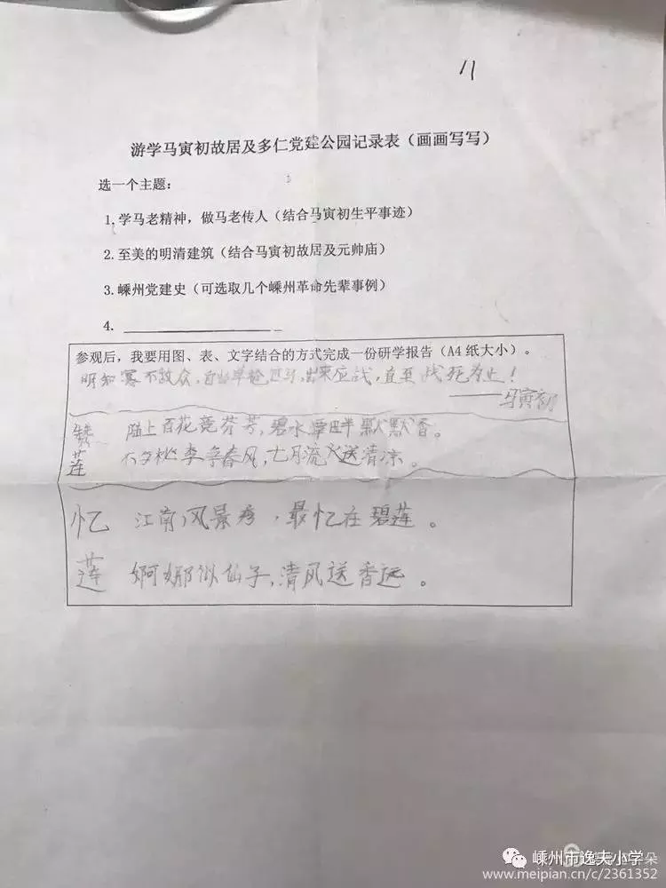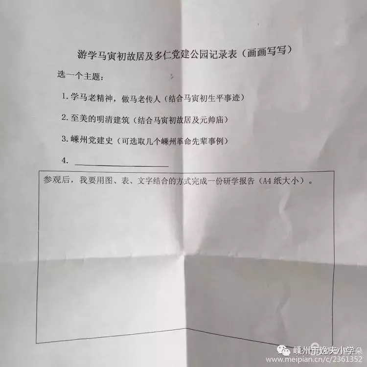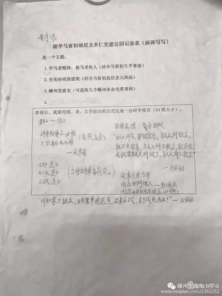 馬寅初先生是我國著名的經(jīng)濟學(xué)家、教育家和人口學(xué)家,其故居位于嵊州市浦口街道。本次逸夫小學(xué)五年級學(xué)生的研學(xué)之旅項目便是參觀"馬寅初故居"。行前一周,我們自由分組,一起商討行程安全事項,老師還送給我們這樣一張研旅菜單。嘿,先了解馬寅初先生的一些情況后再去參觀可能會更有收獲,那么,我們一起查查資料,做做剪報,開個行前交流會。出發(fā)——從市區(qū)到馬寅初故居車程約