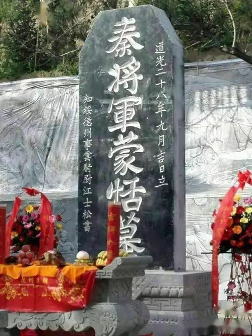 清·道光二十八年九月,綏德州知州事云騎尉江士松為蒙恬手書立“秦將軍蒙恬墓”。因該碑年代久遠(yuǎn)斷為兩截,現(xiàn)存綏德縣博物館。
