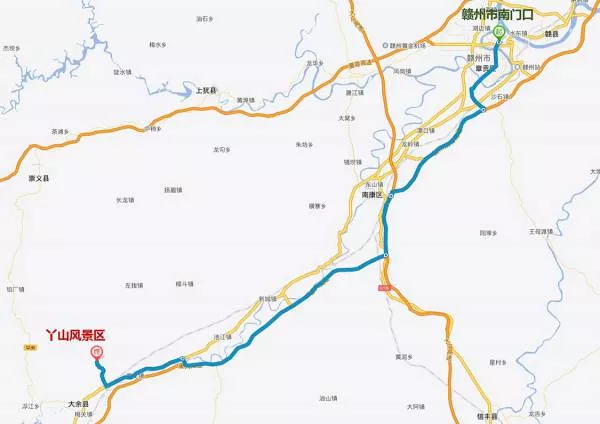 自駕游路線:贛州市南門口——贛州繞城高速——大廣高速——康大高速——G323——丫山風(fēng)景區(qū)