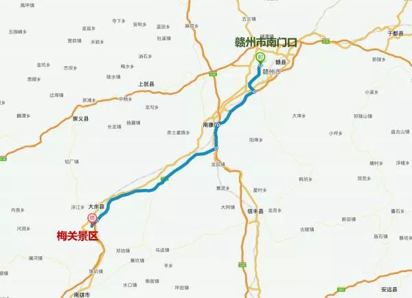 自駕游路線贛州市南門口——贛州繞城高速——大廣高速——康大高速——G323——工業(yè)三路——大余梅關(guān)景區(qū)