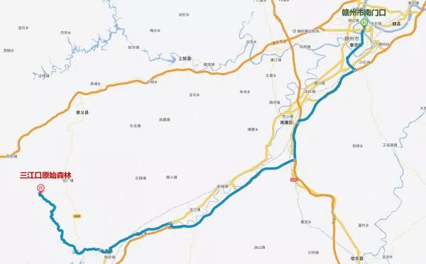 自駕游路線:贛州市南門口——贛州繞城高速——大廣高速——康大高速——G323——S230——三江口原始森林