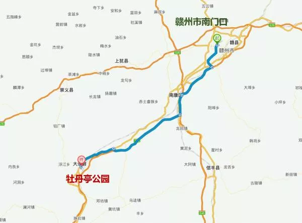 自駕游路線:贛州市南門口——贛州繞城高速——大廣高速——康大高速——G323——牡丹亭公園