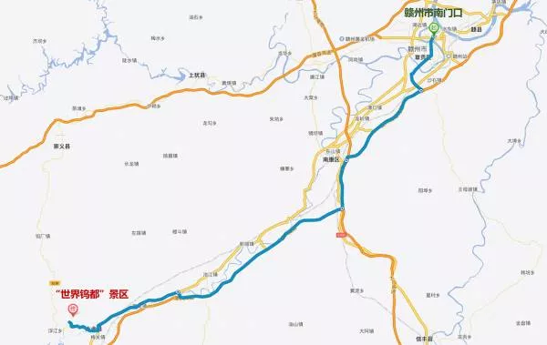 自駕游路線:贛州市南門口——贛州繞城高速——大廣高速——康大高速——G323——“世界鎢都”景區(qū)