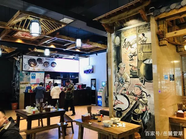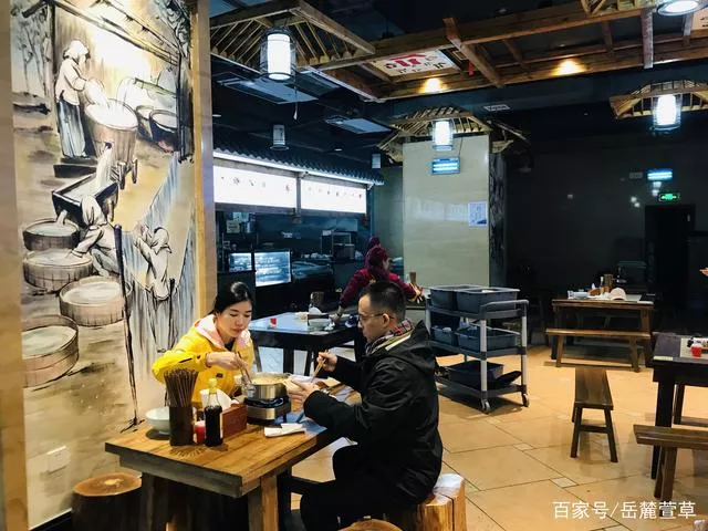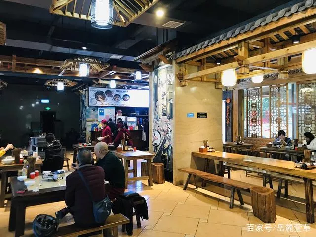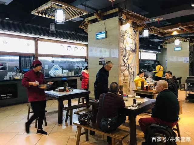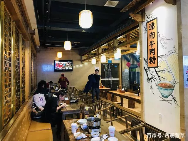 我們在長沙的這家津市劉聾子牛肉粉館坐下,這家店裝修是古色古香風格,木梁黑瓦,墻面上繪有一些老街老巷和介紹米粉的圖案,木質(zhì)長條桌和長凳子,很有老店的味道。