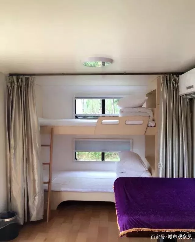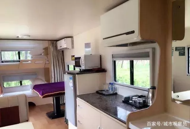 每輛房車?yán)锒紳M足一家四口的入住標(biāo)準(zhǔn),配備了雙人床、高低鋪、沙發(fā)、空調(diào)、電視、網(wǎng)絡(luò)、洗手間,另外還有微波爐和冰箱等,可以在里面做一些簡(jiǎn)單的食物。