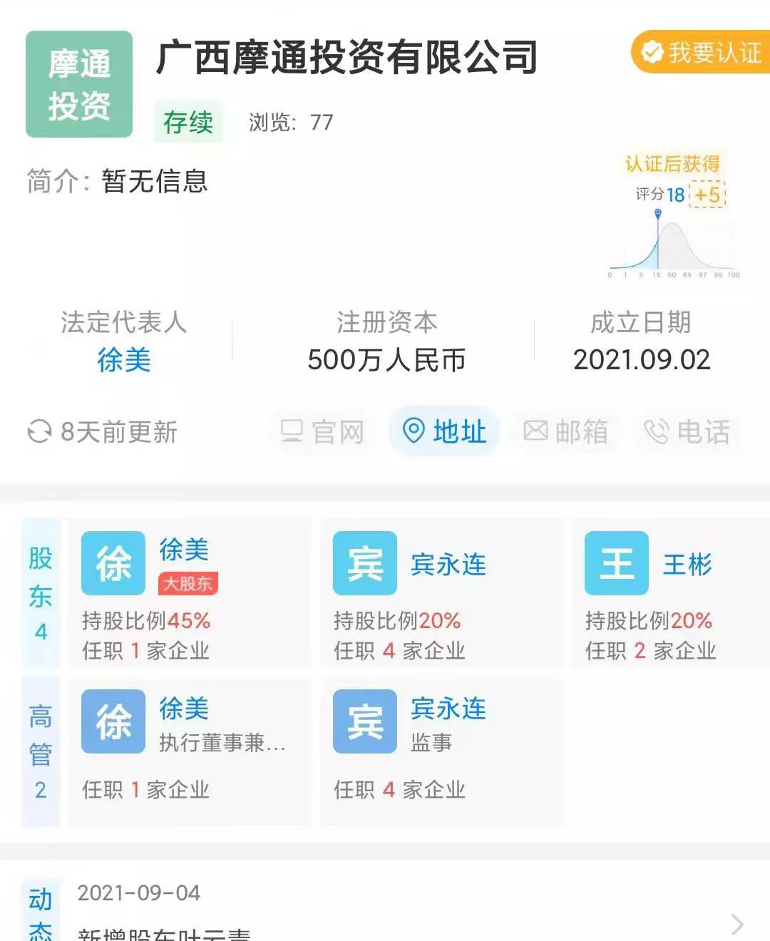 而從宣傳內(nèi)容來看,建設(shè)這個(gè)情人島銀海港灣公園的企業(yè)叫做廣西摩通投資有限公司,這是一個(gè)今年九月份才注冊(cè)成立的一個(gè)新公司,一共有四個(gè)個(gè)人股東。