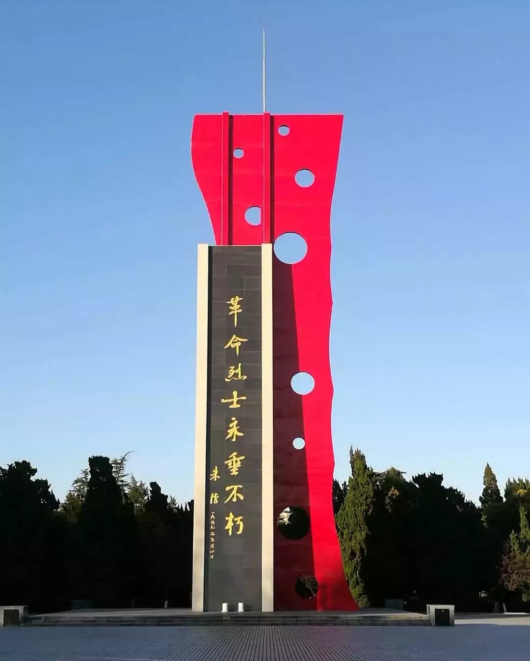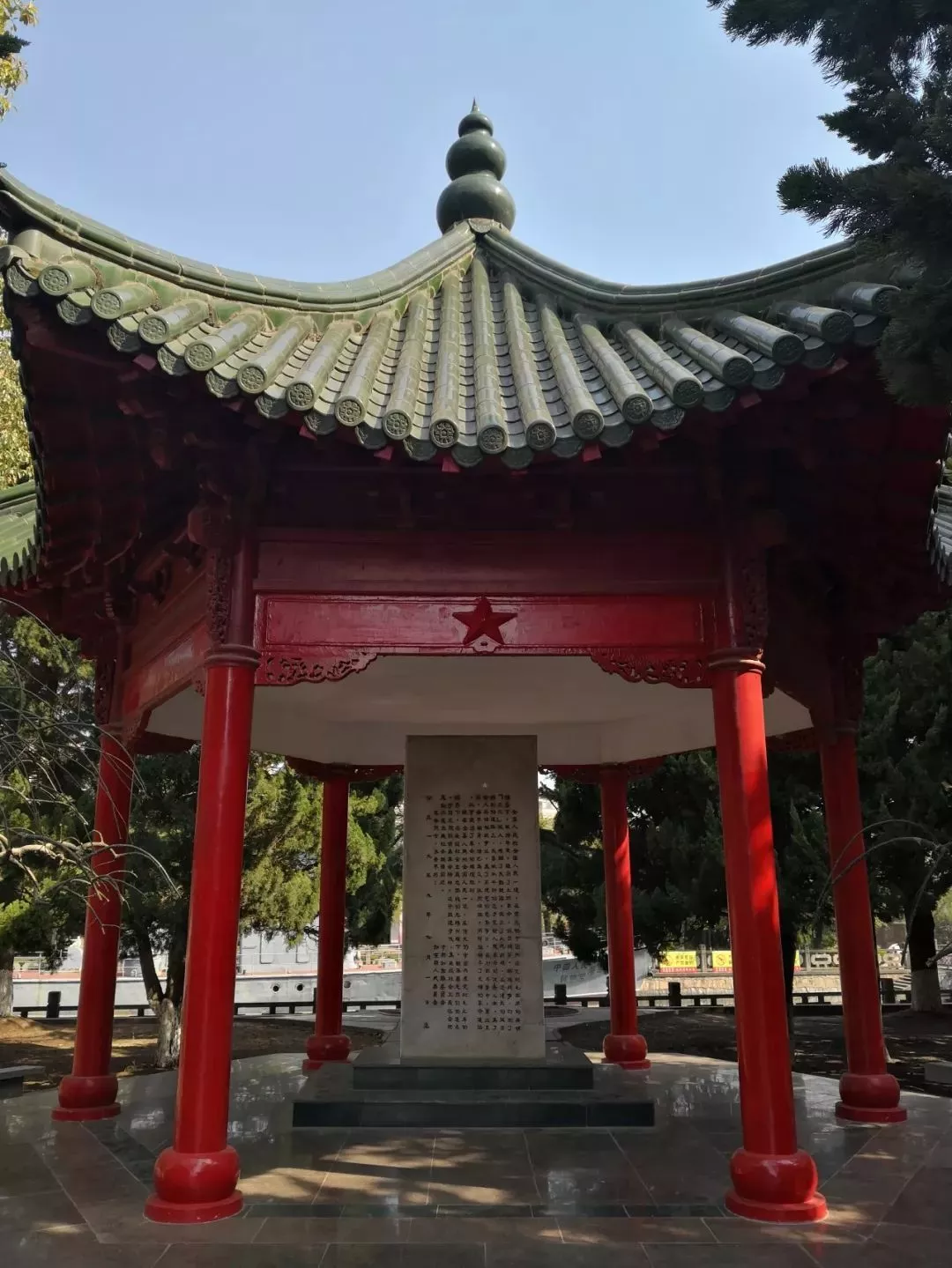 烈士墓后的紀念亭,與烈士塔遙相呼應,六角尖頂,綠色琉璃,紅色廊柱。亭內正中立有2.2米高大理石碑,潔白如玉。碑身用隸書鐫刻著中共如東縣委員會、縣人民委員會攥寫的碑文。亭畔數十棵樹齡60余年的龍柏和7米多高的棕櫚,郁郁蔥蔥,終年長青。