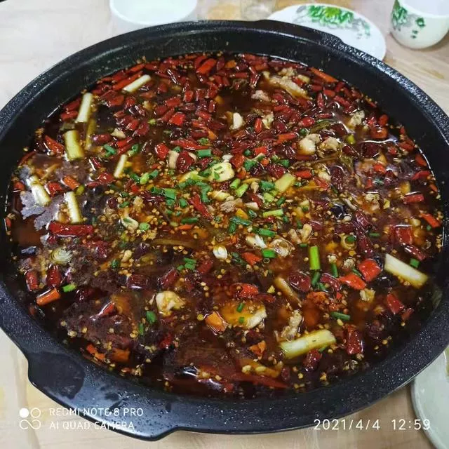 咽了一個小時的口水,總算是排到輪子了。一個大鐵鍋,紅的辣椒、綠的蔥段、滾燙的菜油、白嫩的兔肉、撲鼻的香味,滿滿當當,全是干貨。就算只看這架勢、只看這氣派,也能猜到是內外兼修、貨真價實的正宗美味。