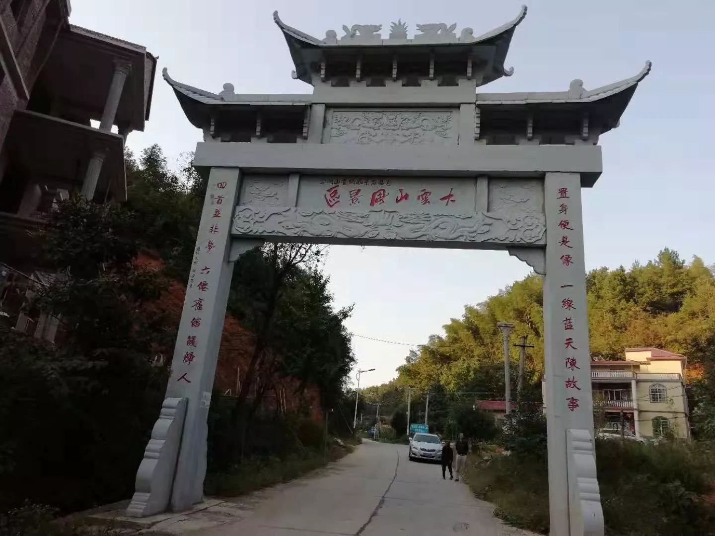 堡面前鄉(xiāng)黨委、政府充分利用區(qū)域特色資源打造旅游品牌,為提升風(fēng)光旖旎的大云山的文化品位,在大云山風(fēng)光帶建造了兩座永久性的牌坊,在牌坊正反兩面鐫刻了對聯(lián)。