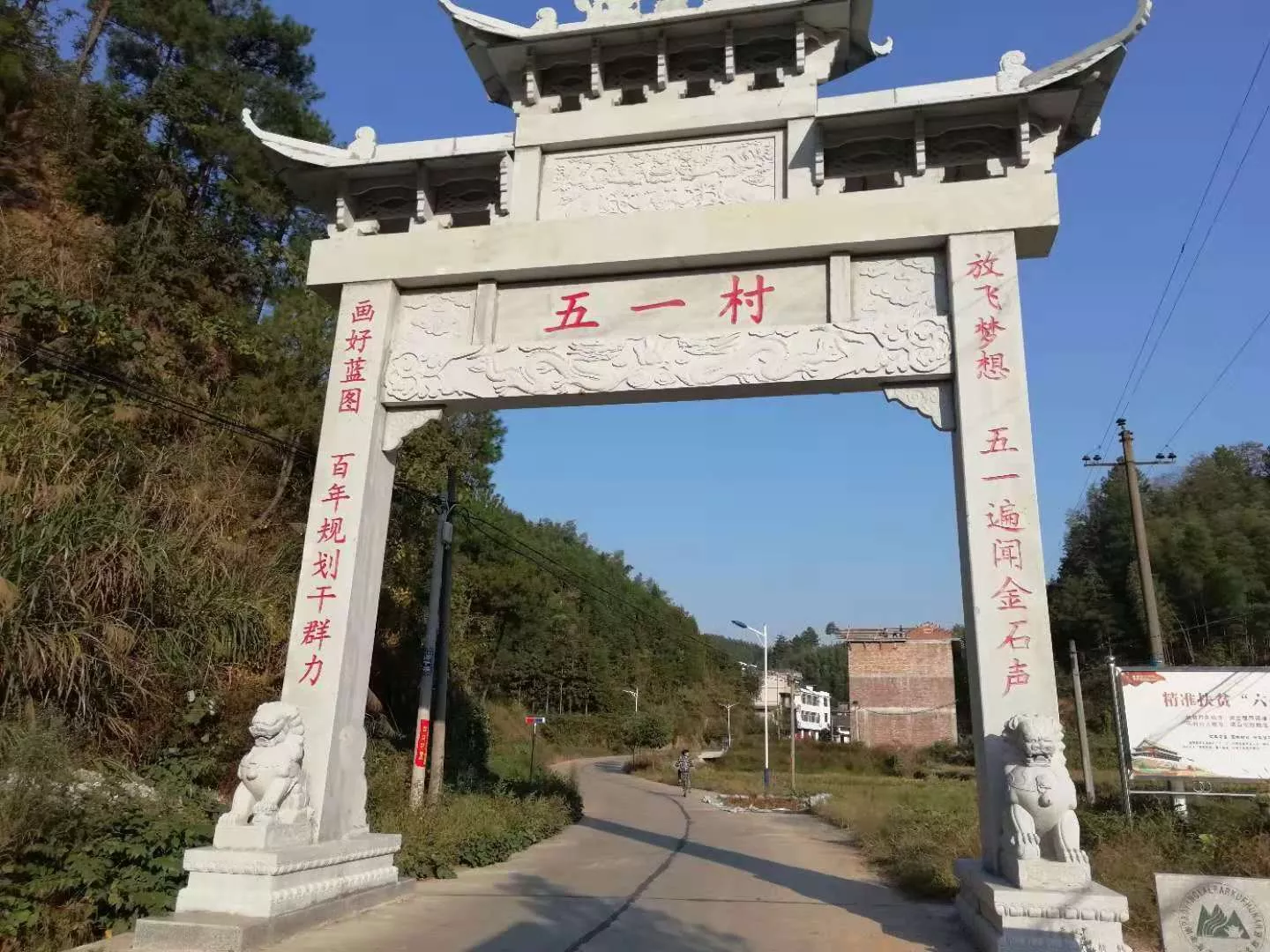 “畫好藍(lán)圖,百年規(guī)劃干群力;放飛夢想,五一遍聞金石聲”。此聯(lián)明白曉暢,通俗易懂,百年的發(fā)展藍(lán)圖和規(guī)劃凝聚著干部與群眾的智慧和力量;在大云山風(fēng)光帶核心地段“五一村”到處可以聽到放飛夢想、砥礪奮進(jìn)的鏗鏘之聲。2016年堡面前鄉(xiāng)黨委、政府調(diào)整行政區(qū)劃時將原五一村、金石村合并為“五一村”,下聯(lián)巧妙地將“五一、金石”嵌入其中,天衣無縫。