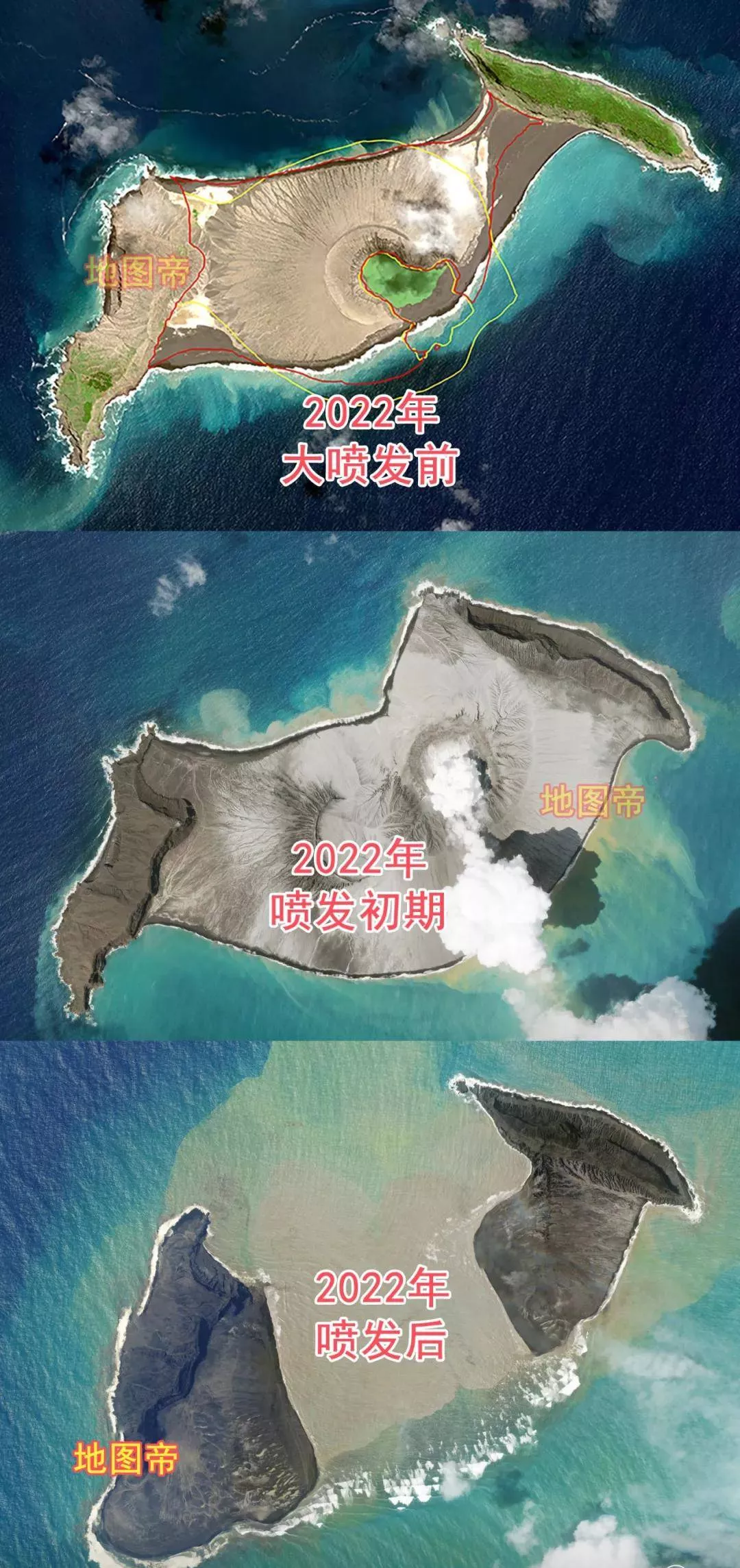 過去幾十年,湯加的洪阿哈阿帕伊島,由于火山噴發(fā)逐漸露出海面,而且面積在增大。然而2022年這次大噴發(fā),產生爆炸,導致海面上的部分坍塌,空中看中間完全沒有了,只剩兩側形成兩個小島。隨著海底火山持續(xù)噴發(fā),造成地震等影響,湯加這座火山口可能會徹底崩塌,從海面上消失。