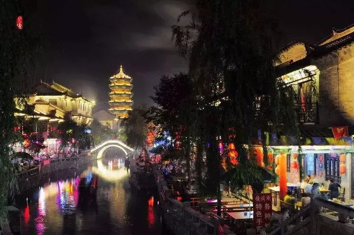 晚上欣賞【古城夜景】,青龍河內(nèi)的巨型花燈,個個引人注目?!罢胸斶M(jìn)寶”、“魚躍龍門”……每組燈都有它美好的寓意和祝福,它們沿青龍河散布河道上更顯耀眼奪目。放眼望去,剔透的萬佛塔