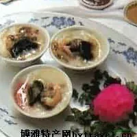 五、把香菇、栗子、蝦米、蠔干、油蔥均分成50份,分別放在餡料的周圍,蝦肉分成50份點(diǎn)綴在餡料上,再將水漿舀入碗里,直至香菇片、油蔥浮上面接近碗面,鴨蛋打散調(diào)成金黃色蛋液,噴在各個(gè)漿碗面上。上籠屜,用旺火蒸25分鐘,取出晾涼,逐碗用薄竹片沿碗邊繞割一圈,使熟漿不粘碗,再割成8塊即成。