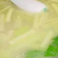 奶湯蒲菜是以濟南大明湖出產(chǎn)的一種質(zhì)地鮮嫩、色澤潔白、味道清鮮的蒲菜為主料,配有苔菜、冬菇、火腿片、加奶湯烹制而成,歷來被人們譽為濟南第一湯菜