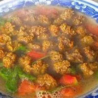 3、在炸丸子的同時(shí),另備一鍋,加高湯,將木耳、黃花菜、番茄放入,加鹽、料酒、胡椒粉、醬油、雞精,湯沸后用香醋和勻淀粉勾芡,最后淋入香油,撒上香菜,將炸好的丸子趁熱倒入湯中即可。