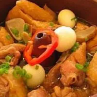 汽鍋雞是云南的名菜之一,早在2000多年前就在滇南民間流傳。建水出產(chǎn)一種別致的土陶蒸鍋,叫“汽鍋”,是專門用來蒸食物的。汽鍋雞的做法是鈄仔雞洗凈后在砍成小塊,和姜、鹽、蔥、草果一道放入汽鍋內(nèi)蓋好,汽鍋置于一放滿水的湯鍋之上,用砂布將隙縫堵上,以免漏汽,再放到火上煮。湯鍋的水開后,蒸汽就通過汽鍋中間的汽嘴將雞逐漸蒸熟(一般需3 ~4小時(shí))。由于湯汁是蒸汽凝成,雞肉的鮮味在蒸的過程中喪失較少,所以基本上保持了雞的原汁原味。吃起食客的贊譽(yù)。如果在汽鍋中分別加入云南出產(chǎn)的珍貴藥材“三七”、“蟲草”、“天麻”、就叫三七汽鍋雞,蟲草汽鍋雞,天麻汽鍋雞。這不僅增加了營養(yǎng)價(jià)值,能滋補(bǔ)強(qiáng)身,而且對(duì)體弱、頭昏、管力等癥還有一定作用,對(duì)冠心病、神經(jīng)衰弱等具有療效。