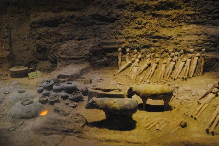 漢代諸侯王和官爵二十級(jí)的列侯墓,都有邊長(zhǎng)10米以上的豎穴,多重棺槨,或黃腸題湊,或石室墓、磚槨墓、崖洞墓。墓中隨葬品豐富,有車馬、銅漆禮器、日用器及大批陶器、玉石器、木器等,有的有玉衣。木槨墓主要流行于西漢,東漢時(shí)期諸侯王墓不再使用木槨墓。