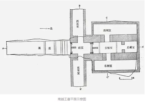 (四)石室墓:即以石塊砌筑墓室。漢代諸侯王墓中只有豎穴巖坑石砌墓一種,雖為數(shù)不多,但確是一個(gè)重要類型,主要分布于江蘇徐州楚王山、河南永城窯山、僖山,山東巨野紅土山、廣東廣州象崗。典型的有廣州象崗南越王墓,墓主為第二代南越王文帝趙昧,是漢代少數(shù)未被盜掘的諸侯王墓之一,形制結(jié)構(gòu)和葬俗在西漢石室墓中最為突出和獨(dú)特。南越王墓是豎穴與掏洞相結(jié)合的一座大型石室墓,平面呈“早”字形,由斜坡墓道、甬道、前室、中室和后室組成,前室兩側(cè)有東西耳室,中室兩側(cè)有東西側(cè)室,長(zhǎng)度為中室和后室之和,使墓室后半部的平面形成方形結(jié)構(gòu)。因?yàn)槟显絿?guó)與南海國(guó)同屬于百越部落,所以,我們可以猜想,如果南海國(guó)王的墓葬還有遺存,那么也許會(huì)與南越王墓有些類似。