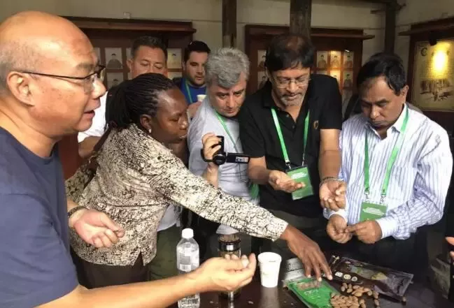 圖為外賓在現(xiàn)場了解香榧