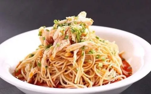雞絲涼面 雞絲涼面是四川成都著名的傳統(tǒng)小吃,歷史悠久,廣泛流傳于成都等四川等地,在四川全省有很大影響,被成都市政府評(píng)為“成都市名小吃”。其特點(diǎn)是多味調(diào)合,清爽利口,面條有筋力,為夏季佳品。傳統(tǒng)雞絲涼面的做法很簡單,將機(jī)制的面條入沸水中煮熟,煮時(shí)不能煮得太軟,撈出放案板上趁熱灑熟菜油少許,抖散快速降溫,到互不粘連且已冷卻為止,成為涼面。然后放在大盤子上,加色拉油和麻油拌勻,盤底放入開水燙熟的綠豆芽。再將雞絲鋪放在面條上(雞胸肉煮熟,放冷后切絲),加上芝麻醬等各種調(diào)味料調(diào)勻,澆到面上再撒下蔥花和碎花生米即可。中文名:雞絲涼面外文名:cold noodles with chicken slices主要食材:堿水面,雞腿,黃瓜分類:四川小吃,四川的傳統(tǒng)小吃,口味:酸辣制作難度:簡單 贊 (0) 39 151 生成海報(bào) 蛋烘糕 下一篇 2008-08-08 糖油果子 上一篇 2008-08-08 相關(guān)推薦