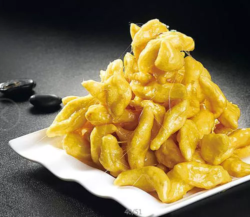 酥黃菜是哈爾濱的傳統(tǒng)菜肴,在東北地區(qū)特別流行,經(jīng)常作為宴席里的壓桌甜菜,也是哈爾濱著名的宴席名菜。酥黃菜最早的名字叫“酥白果”,雞蛋入菜,飯館中稱“白果”,早在民國時期,“白果菜肴”是哈爾濱大飯館中的常見甜菜。酥黃菜是東北的特色拔絲菜肴之一,做法非常簡單,食材也非常簡單,由雞蛋、淀粉為主要食材,配以油、糖等輔料制作而成,成菜松軟酥香,味道甜美,酥香甜脆,老少皆宜。酥黃菜更是被評為“哈埠十大經(jīng)典名菜”?!驹敿?xì)】