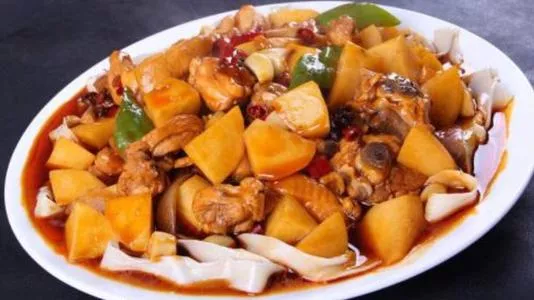 新疆大盤雞 新疆大盤雞又名沙灣大盤雞、辣子炒雞,是20世紀80年代起源于新疆公路邊飯館的江湖菜,主要用雞塊和土豆塊炒燉而成,還同新疆特色的馕、皮帶面搭配食用,其特點是:爽滑麻辣的雞肉和軟糯甜潤的土豆,辣中有香、粗中帶細,成為新疆最具代表的特色名菜。新疆大盤雞入選由中國烹飪協(xié)會主辦的“世界發(fā)布‘中國菜’活動暨全國省籍地域經(jīng)典名菜”中新疆榜名單,被評為“中國菜”新疆十大經(jīng)典名菜,還在第七屆烏魯木齊國際食品餐飲博覽會上被評為“新疆十大名菜”?!驹敿殹?br />中文名:新疆大盤雞外文名:The Xinjiang market chicken分類:新疆菜,西北菜口味:鮮、辣、麻主要食材:雞肉,土豆,辣椒,洋蔥,四川粉皮,皮帶面起源地:沙灣縣 贊 (0) 39 151 生成海報 海南白切文昌雞 下一篇 2008-08-08 酸辣禾花魚 上一篇 2008-08-08 相關(guān)推薦