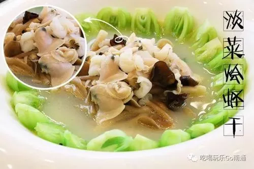 燴蟶干也叫蟶干湯或煨蟶干,是南通著名的特色菜,屬于蘇菜之通幫菜、江海菜,也是江蘇如東地區(qū)酒席上必不可缺的一道頭菜。作為如東海鮮的代表菜肴,煨蟶干選用的必須是本港的竹蟶,蟶湯,經(jīng)泡發(fā)等好幾道秘傳工序后才成的,蟶湯有濃郁獨(dú)特的南黃海海鮮味覺效果,湯濃,味醇,令人難以忘懷。成菜在白色的乳湯中懸浮著若隱若現(xiàn)的竹蟶,有“玉人泳浴”之美,其味更是鮮美絕倫。竹蟶柔滑香鮮,湯汁如乳,蟶湯滴在桌子上都不會(huì)散珠,風(fēng)味超然,令人回味悠長(zhǎng)。2018年?duì)Z蟶干被南通市評(píng)為“南通十佳名菜”,在江蘇省餐飲協(xié)會(huì)主辦的“江蘇13市地標(biāo)美食”