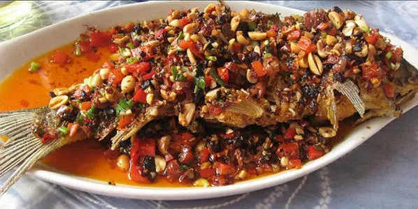 東巴烤魚,又稱納西烤魚,是云南麗江茶馬古道上一道傳統(tǒng)美食,也是麗江納西族代表名菜。納西烤魚采用特制配方的香料進(jìn)行腌制,以豆豉為主要配料,經(jīng)烤,炸,煎等多道工序精心制作而成,此菜味微辣,口感鮮美,皮焦肉嫩。納西烤魚一般精選野生草魚、鯽魚或鯉魚,宰殺后運(yùn)用獨(dú)特的手藝去除魚腥,保留了魚肉特有的鮮嫩并采用獨(dú)門秘方進(jìn)行腌制和烹飪,整條烤魚外脆內(nèi)嫩,吃起來味道非常鮮美。東巴烤魚配合風(fēng)味的豆豉在一起,整個魚的風(fēng)味非常香,再加上各種美味的佐料配合在一起,讓人回味無窮。東巴烤魚一定是到麗江必吃的一道菜,麗江無論是小餐館還是