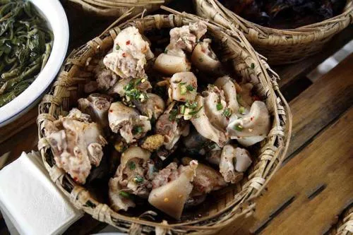 麗江坨坨肉 麗江坨坨肉,因其每坨的重量均在二三兩上下,成坨狀,故名,是麗江彝族人重大喜慶日子常見的桌上菜,是一道彝族的傳統(tǒng)美食,彝語稱“烏色色腳”,也是麗江寧蒗少數(shù)民族大塊吃肉大塊喝酒的傳統(tǒng)菜。這道菜的做法是將剛滿月的小豬宰殺后切塊,腌制,加上寧蒗特有的秘制干腌菜,花椒大鍋煮熟,小豬肉細嫩柔軟,肥瘦相間,帶有濃濃的花椒香味,卻吃不出麻味來,喝湯時肉香,腌菜特別的酸味,和花椒味道融合在一起。坨坨肉成為了寧蒗飲食的一大特色,是彝族人飲食文化中最具代表性的一道菜。 贊 (0) 39 151 生成海報 東巴烤魚 下一篇 2008-08-08 黑山羊火鍋 上一篇 2008-08-08 相關(guān)推薦
